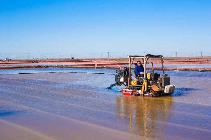 春扒現(xiàn)場,座座銀山悄然聳立。職工們駕駛扒鹽機(jī)穿梭在結(jié)晶池中,制鹵工充分利用天氣,多趕鹵趕好鹵,電管站和維修工隨時(shí)待命,現(xiàn)場一片繁忙景象。